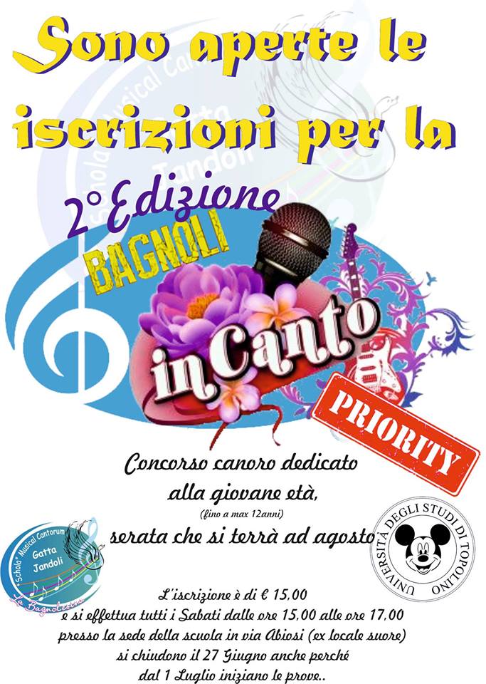 Anche quest’anno la Schola Musical Cantorum Gatta-Jandoli organizza 2 spettacolo-eventi molto attesi dalla comunità bagnolese. Si inizia con la seconda edizione di “Bagnoli in Canto”, concorso canoro dedicato ai bambini più piccoli (età massima 12 anni), che saranno seguiti per tutto il periodo che va dalle prove fino alla gara da un team di esperti musicisti.