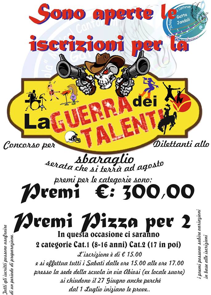 La seconda serata in programma è la “Guerra dei Talenti”, uno spettacolo dove i partecipanti potranno esibirsi nella performance artistica che preferiscono: canto, ballo, cabaret, mimo ecc.. La competizione è suddivisa in 2 categorie: ragazzi dagli 8 ai 16 anni e quella dai 17 in su. Ai vincitori del concorso vanno 300.00 euro, pizza ai secondi classificati.