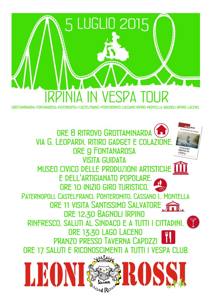 Ma affinché la volontà di promuovere l’Irpinia nella sua essenza paesaggistica non sia solo una dichiarazione di intenti, il Vespa Club leoni Rossi ha già dato alle stampe nel 2009 un calendario, ed è in procinto di proiettare in sala il cortometraggio già presentato all’Ariano Film festival che narra di una storia d’amore vissuta in Irpinia, sulle due ruote.