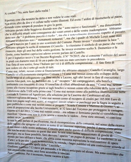 Come mai, infatti, nessun cenno ai finanziamenti che abbiamo ottenuto (castello Cavaniglia, largo Castello ed efficientamento energetico Comune)? Come mai nessun cenno allo sviluppo della banda larga ed al collegamento con fibre ottiche a Laceno, agli altri lavori in fasi di esecuzione (Laceno bike park, rete dei Belvedere etc.) al “recupero” dei campeggiatori, alla bonifica ambientale con rimozione di circa 10 tonnellate di rifiuti abbandonati da anni? Come mai nessun cenno alle risorse recuperate grazie ai tagli boschivi e nessun cella alla riduzione delle tasse con l’abolizione della TASI sulla prima casa? Come mai nessun cenno alla pubblica illuminazione nelle contrade San Lorenzo e Agnolivieri, alla soluzi0ne per la Caserma dei Carabinieri e alla videosorveglianza del paese? Come mai nessun cenno al recupero di crediti per 185.000 Euro di tasse non pagate negli anni scorsi, ai maggiori introiti relativi ai parcheggi per la Sagra in seguito a gare pubbliche e come mai nessun cenno ai progetti “Scuola Comune e Mamma di Giorno, ai corsi di preparazione alle facoltà Universitarie , ai 32 lanci di Torymus per proteggere le castagne, rispetto ai 6 del 2013? Come mai nessun cenno … ma adesso ci fermiamo perché ci vorrebbero due manifesti! Queste cose non le avete sentite e neanche le vedete … forse siete stressati, vi conviene andare un po’ in vacanza.