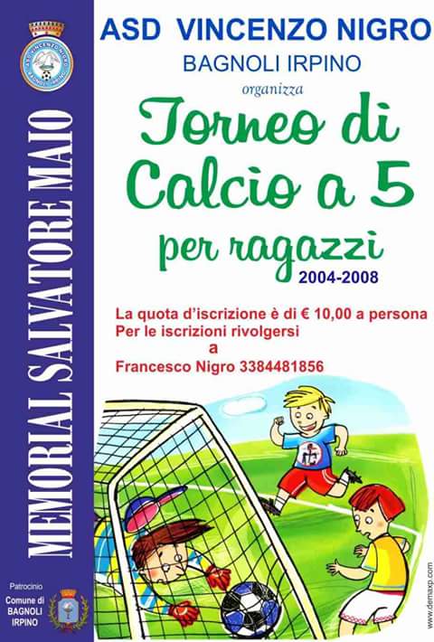 Siamo giunti alla 4 edizione del Memorial Salvatore Maio e anche quest’anno fervono i preparativi in occasione di questa manifestazione sportiva, ma non solo… Il comitato organizzatore, con a capo Tonino D’elia, Luigi Iuppa, Aniello Ierontantico e gran parte dei genitori dei bambini che partecipano al torneo di calcetto, ringraziano anticipatamente tutti gli sponsor, l’amministrazione comunale, l’ A.S.D. Vincenzo Nigro Bagnoli Irpino, che hanno sostenuto questa iniziativa.