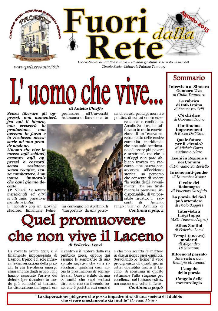 E’ in uscita domenica 16 agosto (festività di San Rocco) “FUORI DALLA RETE”, il 5° numero 2015 del giornale di informazione ed approfondimento del Circolo socio-culturale “Palazzo Tenta 39″. La distribuzione, riservata agli associati, avverrà in Piazza Leonardo Di Capua a Bagnoli Irpino a partire dalle ore 10:00.