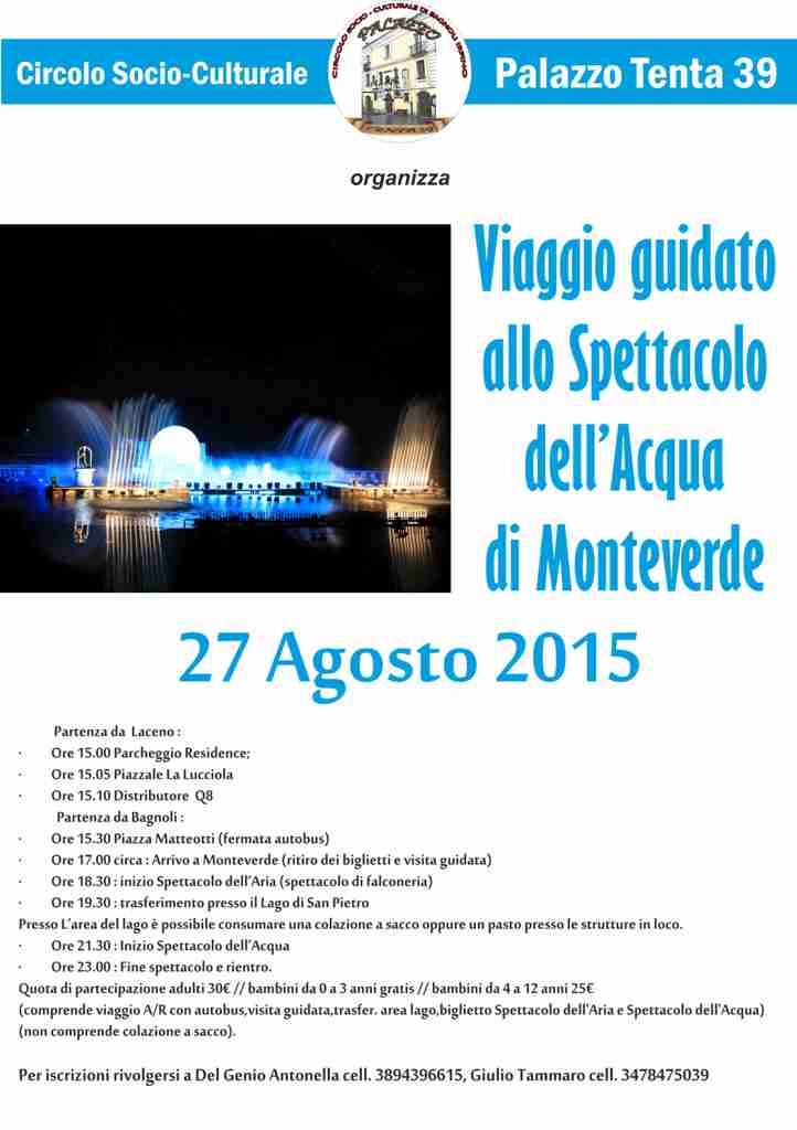 locandinagitapt39Il Circolo socio-culturale “Palazzo Tenta 39” organizza per giovedì 27 agosto un viaggio guidato allo Spettacolo dell’Acqua a Monteverde. Il programma è così articolato: