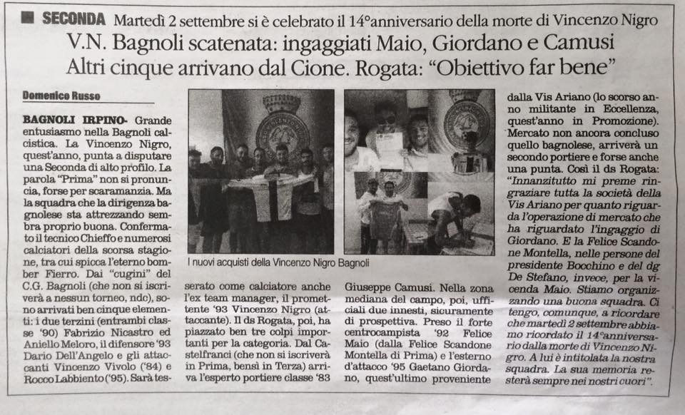 La società calcistica di Bagnoli scatenata: ingaggiati Maio, Gordano e Camusi. Altri 5 arrivano dal Cione Grazia. Rogata: Obiettivo far bene”. Celebrato il 14º anniversario della morte di Vincenzo Nigro.