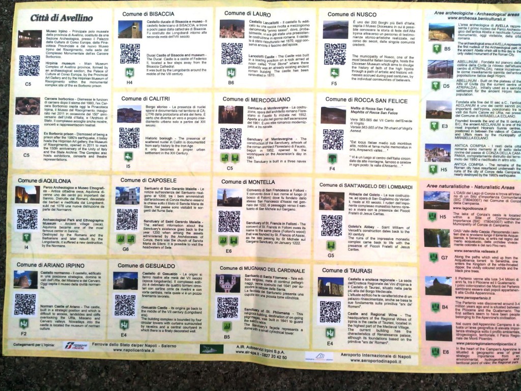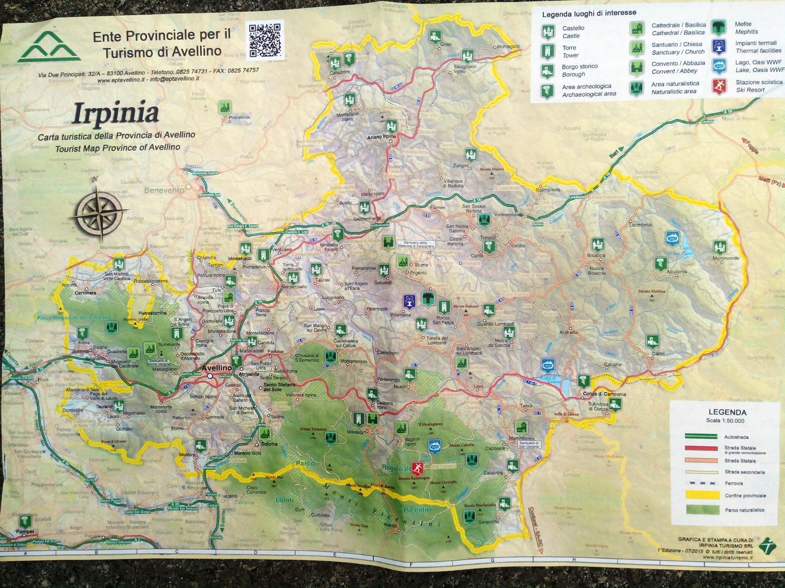 Pochi giorni fa l’Ente Provinciale per il Turismo ha distribuito agli operatori del territorio la nuova “Carta Turistica della Provincia di Avellino” (vedasi foto in basso). Sul retro di questa brochure, vengono menzionati i comuni e i siti di maggiore appeal turistico. Sono citati ben 15 comuni di interesso storico-paesaggistico e 8 tra aree archeologiche e siti naturalistici provinciali.