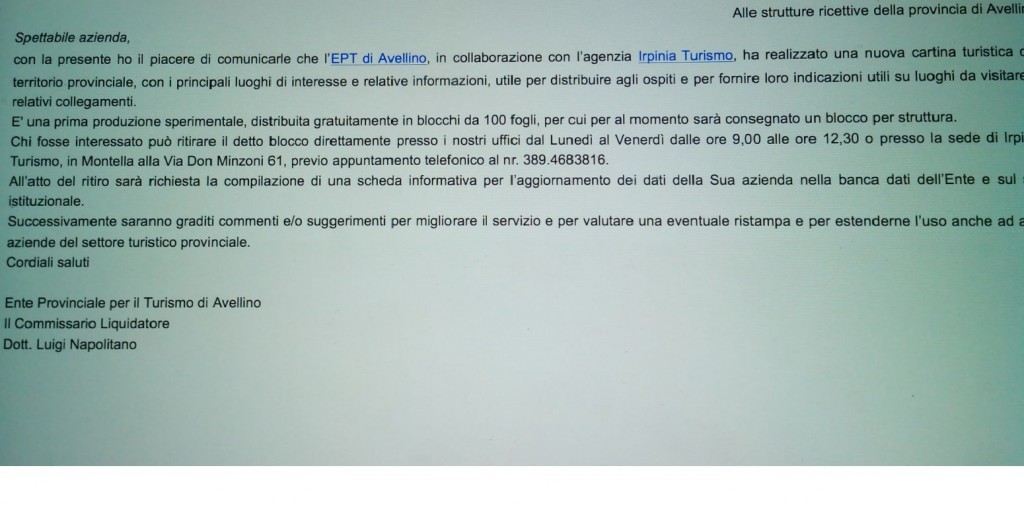 – P.S. in riferimento alla Carta Turistica Provinciale non siamo stati assenti, in quanto alla stessa ha collaborato “Irpinia Turismo” azienda consorziata in giunta vedi Email del 15.09.2015 dell’EPT.