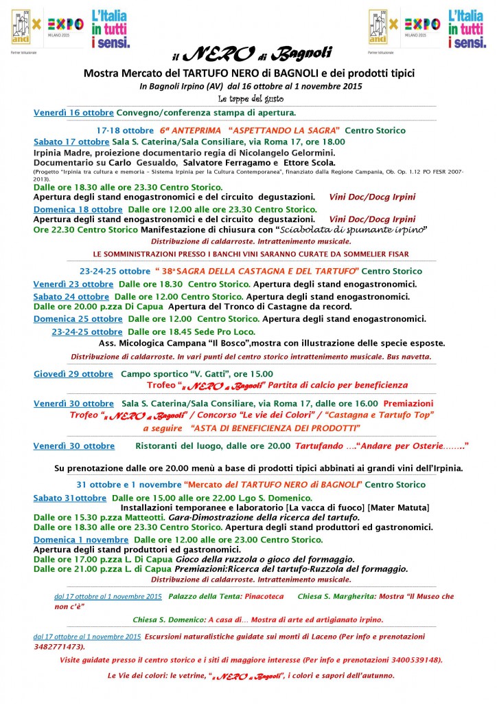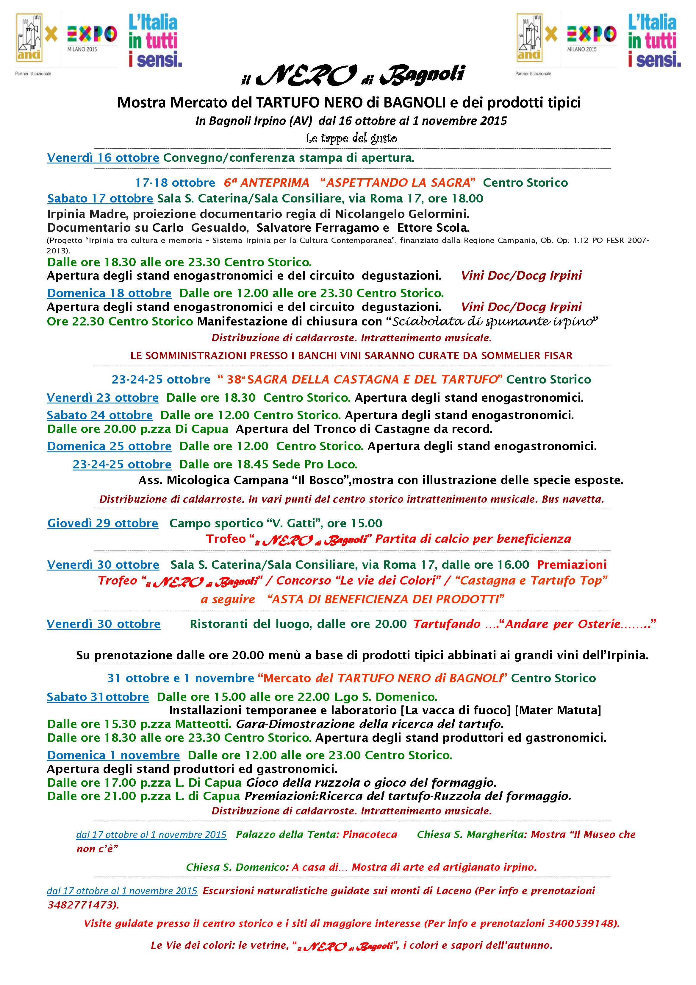 Le novità di quest’edizione 2015 vertono, però, sul piano delle iniziative culturali: si va da un ampio ventaglio di visite guidate offerte da “Palazzo Tenta39” alle escursioni di “Irpinia Trekking”, fino alla gara di cani da tartufo e il tradizionale gioco del lancio del formaggio nell’ultimo weekend dell’evento (31ottobre 1novembre) e al circuito di somministrazione vini curato da sommelier Fisar per la “6° anteprima aspettando la sagra”. Sabato 17 ottobre un convegno aprirà il lungo mese di “Il nero di Bagnoli” con la proiezione del documentario “Irpinia madre”, finanziato dall’Europa. Presso il convento domenicano andranno in parallelo le esposizione di “A casa di…” e del concorso “Vacca di fuoco-Mater Matuta”. Esposizioni che si concluderanno con una serie di laboratori per l’ultimo evento di “Il nero di Bagnoli”: la “Mostra mercato del tartufo nero”. Nei tre weekend anche la chiesa di Santa Margherita sarà sede di una mostra: “Il museo che non c’è”. Grande novità di quest’anno, sarà quella di un polo museale d’eccellenza come la pinacoteca comunale sui macchiaioli ottocenteschi irpini. Giovedì 29 ottobre si scenderà in campo per il trofeo di beneficenza “Il nero di Bagnoli”, a cui si affiancheranno il giorno seguente l’asta dei prodotti tipici e la premiazione della castagna e del tartufo più grande. “Andare per osterie” venerdì 30 ottobre darà, invece, la possibilità di una serata interamente dedicata alle prelibatezze del Laceno presso i ristoranti dell’altopiano. Dulcis in fondo, le vetrine delle attività commerciali bagnolesi si sono sfidate a colpi di allestimenti autunnali nell’ambito del concorso “Le vie dei colori”.