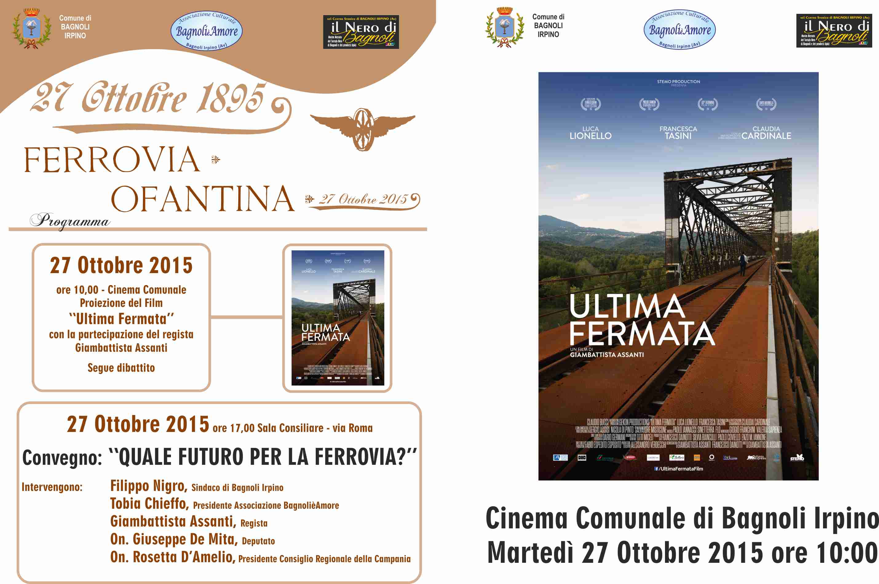 Si comincia con la proiezione alle ore 10 presso il Cinema Comunale di ‘Ultima Fermata’, film-omaggio del regista di Mirabella Eclano Giambattista Assanti, forte del successo alle presentazioni irpine della scorsa settimana in compagnia dell’immensa Claudia Cardinale, co-protagonista nella parte della sarta Rosa.