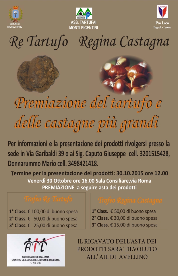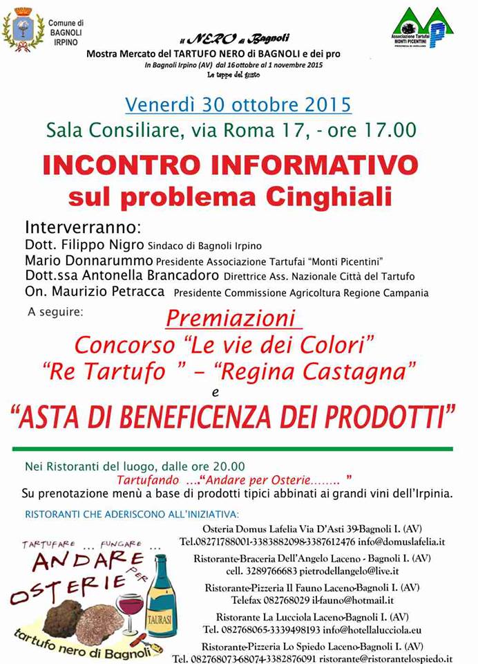 Già da domani sera, i ristoratori del Laceno organizzano “Tartufando …Andare per osterie”: in ogni ristorante e trattoria del territorio sarà possibile degustare le ricette tipiche a base di tartufo. Sabato e domenica il centro storico di Bagnoli ospita la mostra mercato del tartufo e dei prodotti tipici locali: castagne, funghi, pecorino e caciocavalli, vini, miele e prodotti da forno.