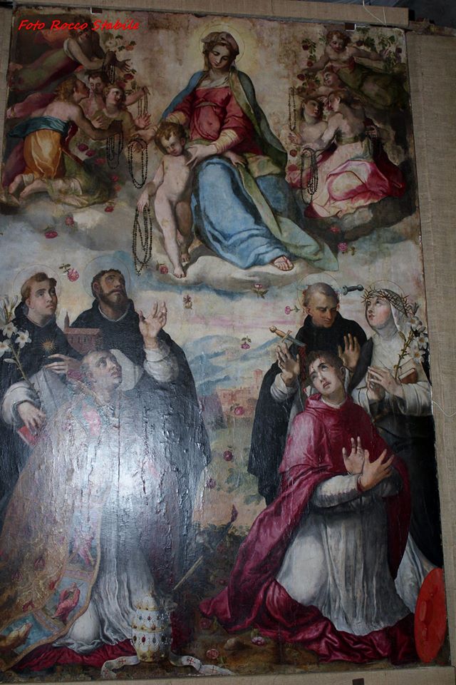 La visita è poi continuata alla volta del monastero domenicano dove ad attenderlo c’era una vecchia conoscenza di Sgarbi: la “Madonna del Rosario” di Marco Pino da Siena, un’opera monumentale del 1576 per commemorare la potenza di Ambrogio Salvio, confessore dell’imperatore Carlo V, e delle famiglie bagnolesi che combatterono la battaglia di Lepanto. Un’opera vittima di pessimi restauri, come spiegato da una delle restauratrici che ha lavorato ai primi interventi conservativi sull’opera, e conservata a pezzi sul pavimento di un monastero: senza deumidificazione e messa in pericolo da frequenti infiltrazioni d’acqua. “Servirebbe un altro terremoto per rimediare ai danni di