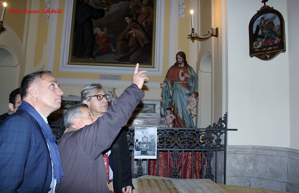 Accompagnato dal primo cittadino dott. Filippo Nigro, dall’assessore alla cultura dott.ssa Grazia Maria Lepore, dall’architetto Gerardo Nappa, dal prof. Tobia Chieffo presidente dell’associazione “Bagnoli è amore” e da Federico Lenzi dell’associazione “PalazzoTenta39 nella veste di guida turisrtica, il tour del critico d’arte Sgarbi è iniziato partendo dalla chiesa di Santa Margherita. Edificio costruito sul finire del quattrocento dai bagnolesi per ingraziarsi la contessa Margherita Orsini e sede di “Il Museo che non c’è”: quadri e statue provenienti dai depositi parrocchiali. Si tratta di prezzi di gran pregio del seicento napoletano, ad eccezione di un Cristo cinquecentesco del fiorentino Giovanni Balducci, tra cui il prof. Sgarbi ha individuato un “Cristo” attribuito al Pacecco che da una sua attenta analisi dovrebbe essere invece dello Spinelli. Sgarbi ha anche apprezzato la tela ottocentesca del Michele Lenzi che raffigura la processione dell’immacolata e una tela seicentesca del