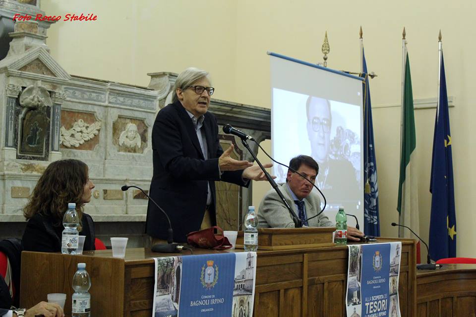 La visita continua alle opere ed i tesori di Bagnoli Irpino con l’inaugurazione della Pinacoteca Comunale e con la visita alle altre chiese del borgo irpino, fino ad arrivare all’incontro-dibattito nella Sala Consiliare del comune in cui hanno preso parola il sindaco Filippo Nigro che ha raccontato la voglia di svolta del paese, non solo visto come eccellenza di enogastronomia, ma anche un paese pieno di cultura. L’assessore alla cultura Grazia Maria Lepore ha introdotto un tema importante che è quello del Laceno d’oro che è partito da Bagnoli ospitando grandi volti e menti del cinema neorealista come Pier Paolo Pasolini. L’architetto Gerardo Nappa che è un cultore dell’arte ha mostrato le bellezze bagnolesi in foto alla platea, molto gremita per l’evento ed infine Sgarbi.