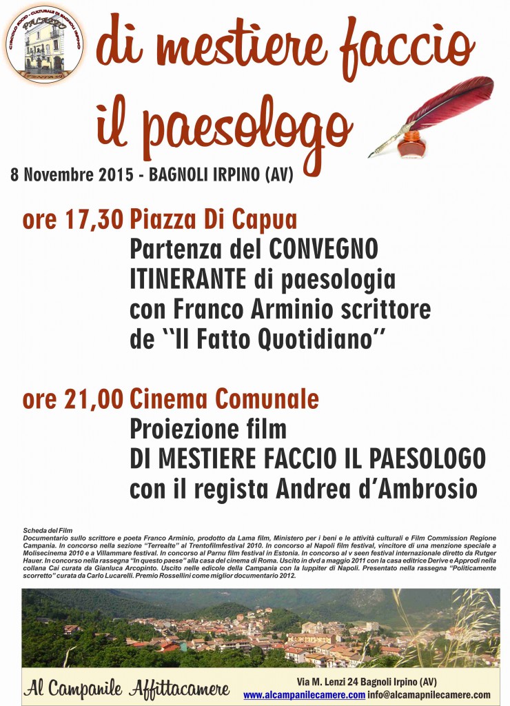 Alle ore 21 l’evento proseguirà presso il cinema comunale con il pluripremiato regista Andrea D’Ambrosio, allievo di Ettore Scola e famoso per le sue opere sul capolarato nella piana del Sele e sulle ecomafie in Campania. Sarà proiettato il suo film “Di mestiere faccio il paesologo”, una produzione che grazie all’abilità del D’Ambriosio riesce a rendere allo stesso tempo la bellezza dei paesaggi irpini, la desolazione degli ultimi abitanti di paesi abbandonati, la felicità nelle piccole cose di una coppia di anziani contadini e il popolo dei bar ultimo sfogo e baluardo di un disagio sociale di comunità in via d’estinzione… A tutto questo si unisce la poetica di Arminio a metà tra il cinismo di Giustino Fortunato e la speranza di Guido D’Orso.