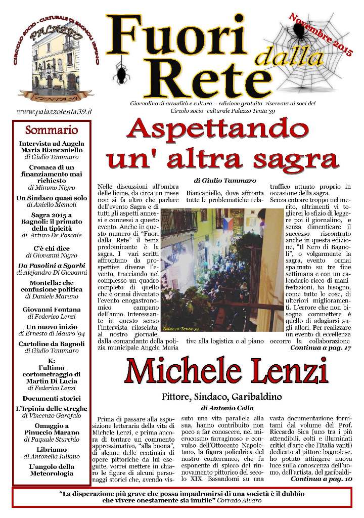 E’ in uscita domenica 08 novembre “FUORI DALLA RETE”, il 6° numero 2015 del giornale di informazione ed approfondimento del Circolo socio-culturale “Palazzo Tenta 39″. La distribuzione, riservata agli associati, avverrà in Piazza Leonardo Di Capua a Bagnoli Irpino a partire dalle ore 10:00.