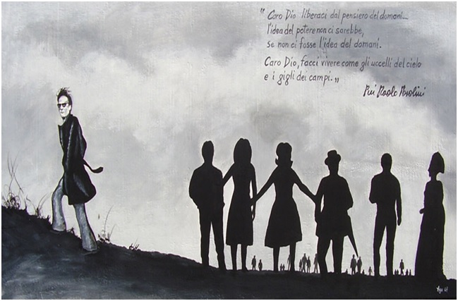 Nella società dei consumi, la matematica e il numero rappresentano le uniche gratificazioni possibili: riempiti i bauli, torniamo a una nuova vita materiale, l’unica arte davvero rinascimentale per l’uomo medio del nostro tempo. Nel marasma postmoderno, si può cogliere il regresso dell’astratta e discreta poesia che ha abdicato a favore di una volgare e urlata mercificazione spettacolarizzata dell’arte, in un ideale passaggio traumatico e definitivo di consegne compiuto in poco più di mezzo secolo, dai pensieri nobili sui verdi paesaggi dell’alta Irpinia di Pasolini ai pasti appagati e in posa di Sgarbi. La riservatezza del poeta alla ricerca di se stesso, l’ idea del suo silente peregrinare solitario alla ricerca di risposte e bellezza, esempio di un’ umanità estinta, e dall’altra l’incedere dell’ uomo mondano perennemente in vetrina, dall’ animo volgare, più che nobile, che non osserva o descrive ma sentenzia con sicumera saccenteria, in un ideale passaggio di consegne, rappresenta la parabola discendente dell’ uomo (e intellettuale) dell’ era postmoderna.