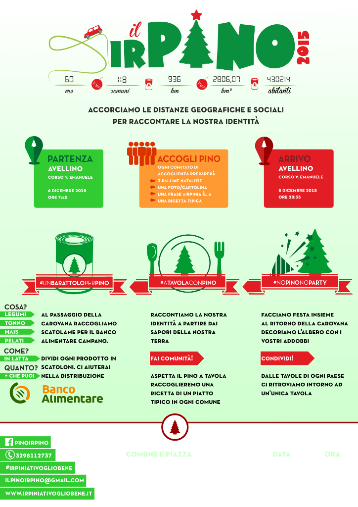 936 chilometri percorsi in 60 ore di viaggio; 118 Comuni attraversati per un totale di oltre 4000 doni raccolti. Sono solo alcuni dei numeri dell’edizione 2014 de “Il Pino Irpino”, la carovana di solidarietà nata da un’idea di sei giovani irpini, che hanno attraversato in tre giorni l’intera provincia al grido di “Irpinia ti voglio bene!”.