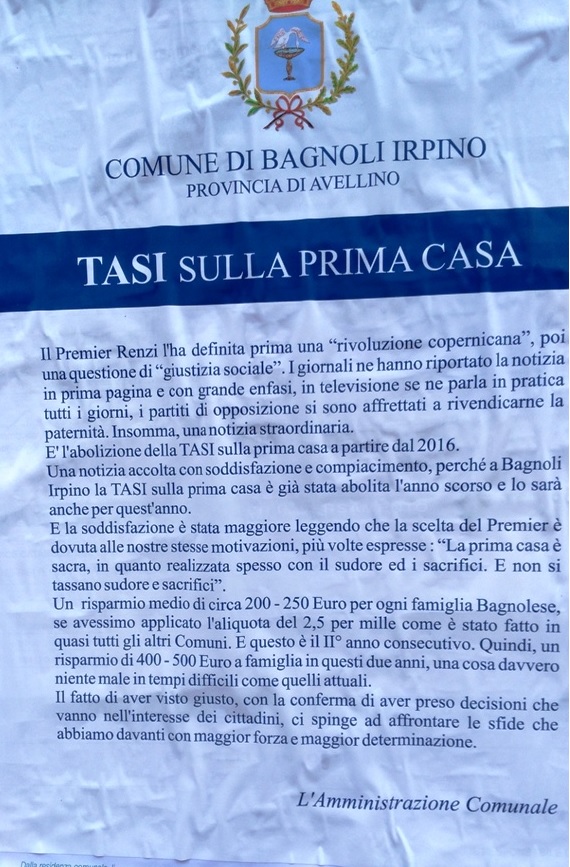 Una notizia accolta con soddisfazione e compiacimento, perché a Bagnoli Irpino la TASI sulla prima casa è già stata abolita l’anno scorso e lo sarà anche per quest’anno.