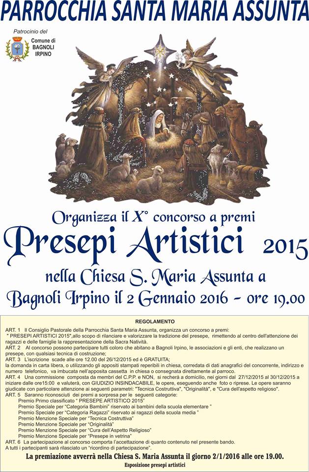 Il Consiglio Pastorale della Parrocchia Santa Maria Assunta, con il patrocinio del Comune di Bagnoli Irpino, organizza il X concorso a premi “Presepi Artistici 2015″. La premiazione è prevista per il 02 gennaio 2016 alle ore 19:00 presso la cattedrale a Bagnoli.