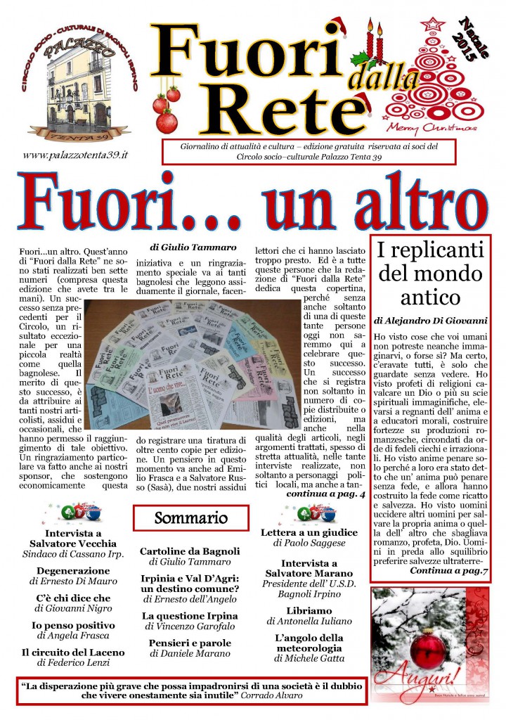 E’ in uscita domenica 27 dicembre: “FUORI DALLA RETE”, il 7° numero 2015 del giornale di informazione ed approfondimento del Circolo socio-culturale “Palazzo Tenta 39″.