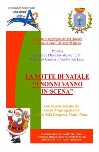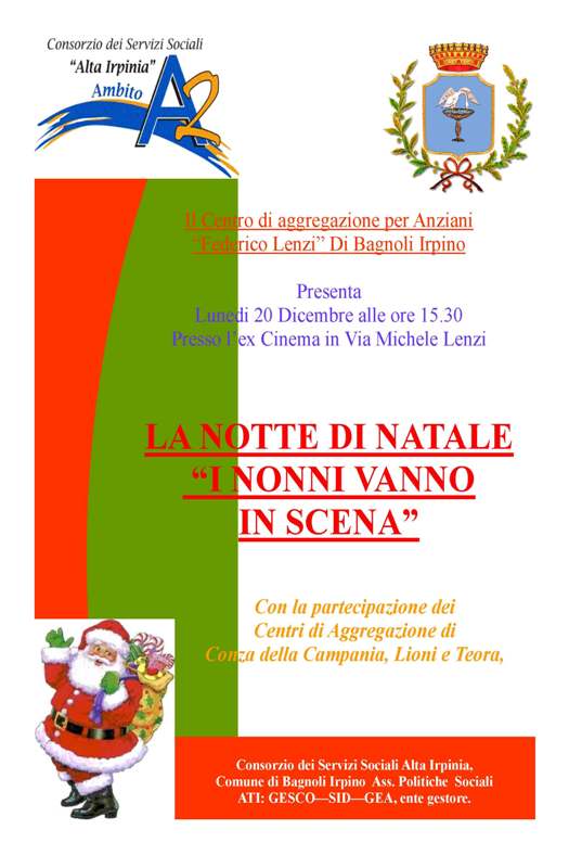 Il Centro di aggregazione per Anziani “Federico Lenzi” di Bagnoli Irpino pesenta per lunedi 20 dicembre alle ore 15.30 presso l’ex Cinema in Via Michele Lenzi LA NOTTE DI NATALE “I NONNI VANNO IN SCENA”. Con la partecipazione dei Centri di Aggregazione di Conza della Campania, Lioni e Teora. Iniziativa in collaborazione con Consorzio dei Servizi Sociali Alta Irpinia, Comune di Bagnoli Irpino Ass. Politiche Sociali ATI: GESCO—SID—GEA, ente gestore.