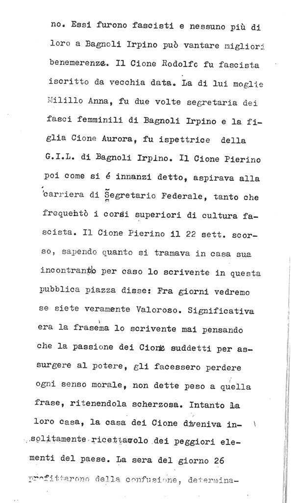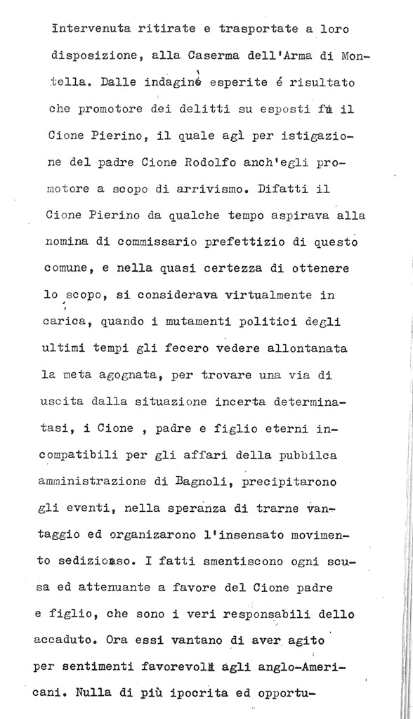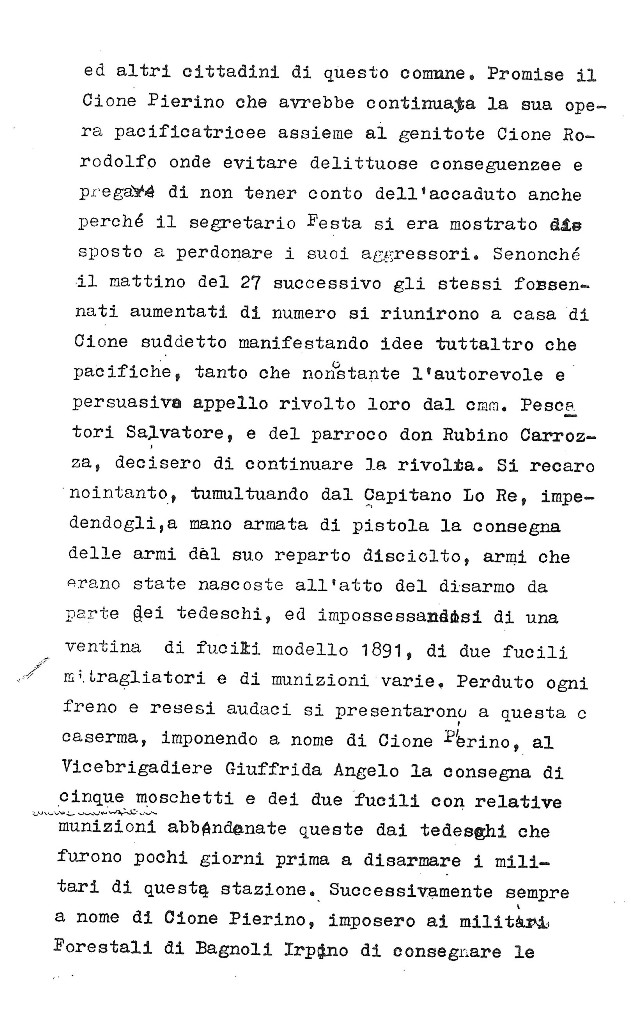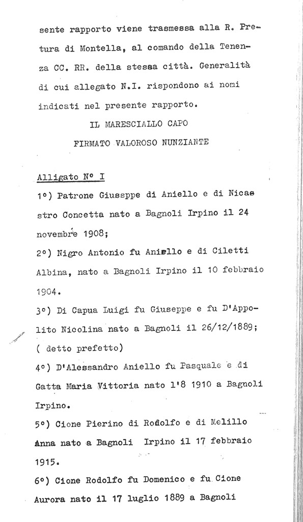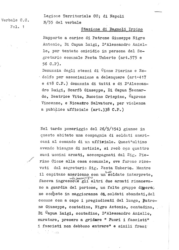 La rivolta contro il potere nazifascita in Irpinia conta diversi episodi tra cui anche alcuni a Bagnoli. In allegato è riportato uno stralcio del corposo processo penale a cui furono sottoposti cittadini di Bagnoli Irpino che già in data 26 settembre 1943 (un giorno prima di Napoli) si ribellarono al potere fascista. Lo stralcio riporta il rapporto del maresciallo capo dei carabinieri Valoroso Nunziante che diviene il maggiore documento per il processo contro i nostri concittadini .Ne do divulgazione senza alcun fine con il convincimento di parlare oramai di storia.
