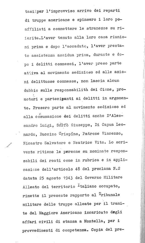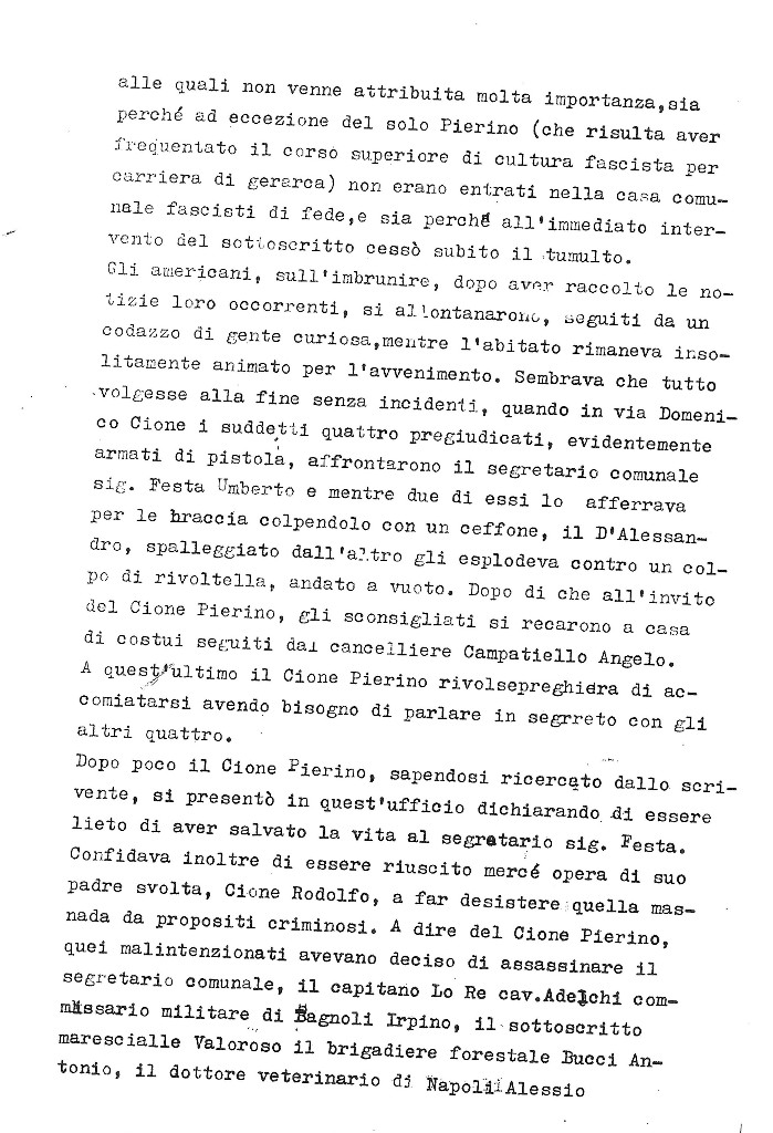 Straordinario documento. Dell’evento ne avevo sentito parlare da mio zio Michele, in quanto uno dei sedicenti facinorosi era per l’appunto mio nonno, Nigro Antonio.Questo verbale integrale dell’allora comandante, ci chiarisce non solo la dinamica degli eventi, ma anche come,all’ombra di un ingenuo impeto di riscatto di alcuni, si celassero fini reconditi di altri.Puro e semplice rigore storico.