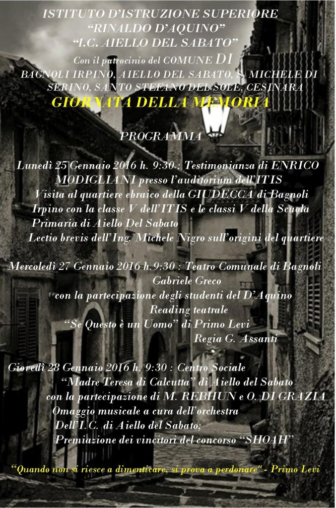 La tre giorni (25,27,28 Gennaio) inizia mercoledì 25 gennaio a Bagnoli Irpino paese in cui sono significative le tracce Ebraiche nel quartiere denominato “Giudecca”. Presso l’aula magna dell’ ITIS, a partire dalle 9.30 e in diretta streaming (per collegarsi allo streaming: www.twitch.tv e cercare “Bagnoli Shoah”), con altre scuole dell’Irpina, ci sarà la testimonianza di Enrico Modigliani sopravvissuto alla Shoah. Successivamente gli studenti accompagneranno gli ospiti dell’IC Aiello del Sabato a visitare la Giudecca incontrando l’ ingegnere Michele Nigro, studioso di storia locale.