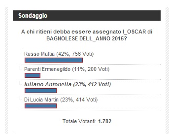 E’ terminata la seconda edizione del “Bagnolese dell’anno”, il riconoscimento volto a premiare le eccellenze del paese. Sul sito di “PalazzoTenta39” si sono registrate 1782 preferenze (in ulteriore crescita rispetto allo scorso anno) che alla fine hanno sancito la vittoria del giovane Mattia Russo con 756 voti. Martin Di Lucia ha chiuso a 414 voti, seguito da Antonella Iuliano con 412 preferenze ed Ermenegildo Parenti con 200 voti.
