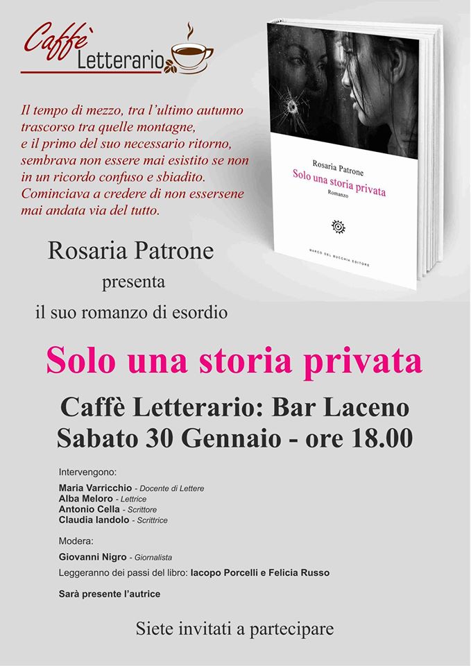Sabato 30 gennaio alle ore 18.00 Caffè Letterario presso il Bar Laceno a Bagnoli Irpino, dove verrà presentato il romanzo di esordio di Rosaria Patrone “Solo una storia privata”. Intervengono: Maria Varricchio (docente di Lettere), Alba Meloro (lettrice), Antonio Cella (scrittore), Claudia Iandolo (scrittrice). Modera Giovanni Nigro (giornalista).