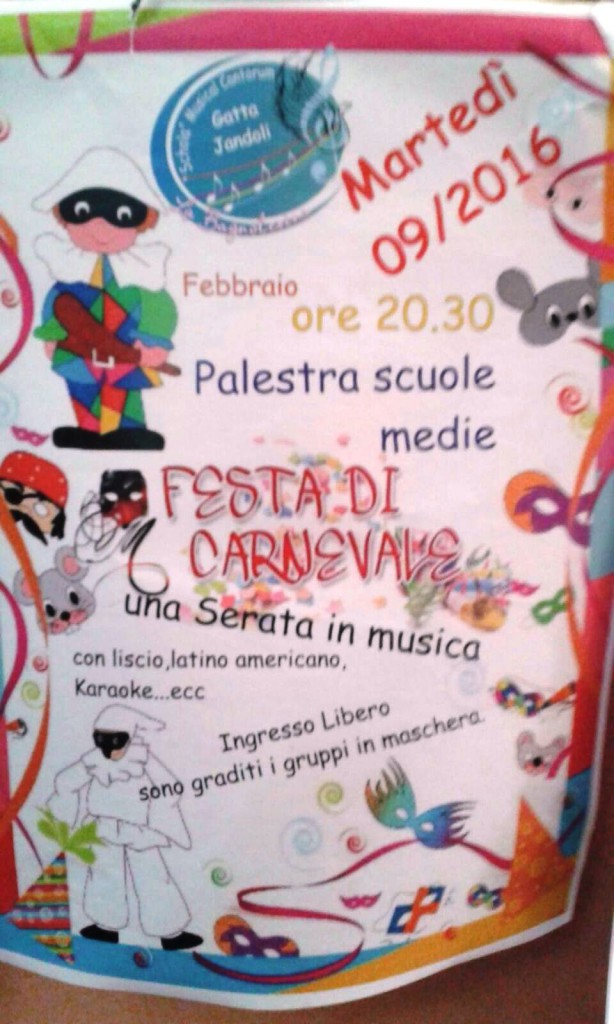 Alle ore 20:30, sempre nella palestra comunale della Scuola Media in L.go San Rocco, la Schola Musical Cantorum Gatta-Iandoli La Bagnolesina organizza una serata in musica per feteggiare il Carnevale, con tanto liscio, latino americano, karaoke e tanto altro ancora