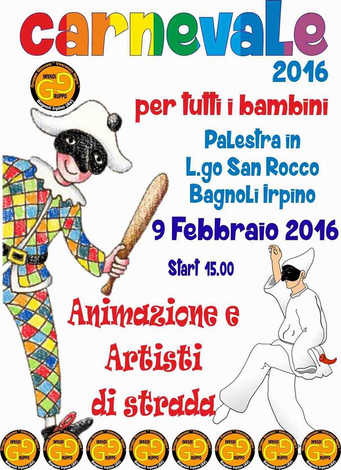 Il Carnevale a Bagnoli Irpino è sempre a firma del Gruppo Giovani Vincenzo Nigro che organizza anche per questo 2016 una festa in maschera per i più piccini. L’appuntamento e per martedì 9 febbraio a partire dalle ore 15:00 nella palestra comunale della Scuola Media in L.go San Rocco. Tanta animazione ed artisti di strada. Sarà premiata la maschera più bella e il gruppo in maschera più bello.