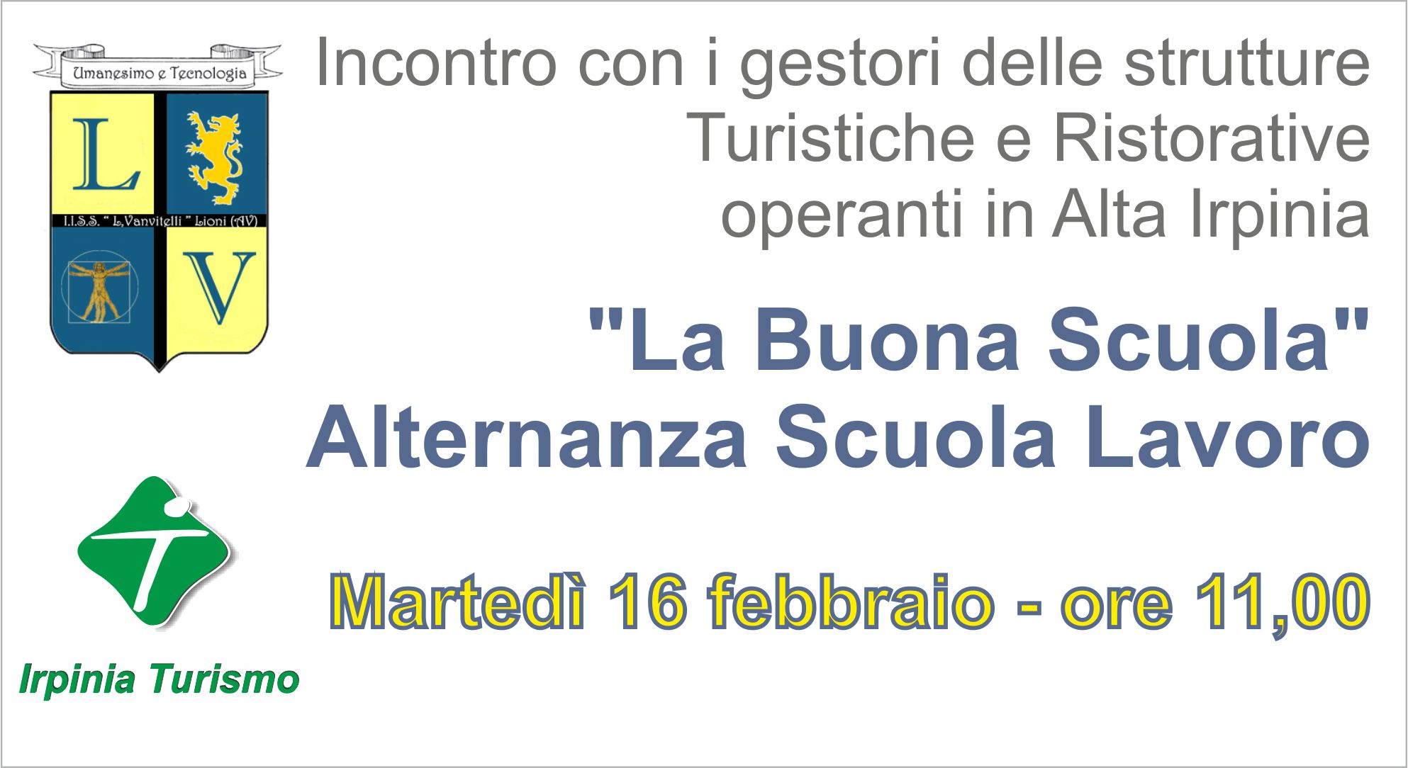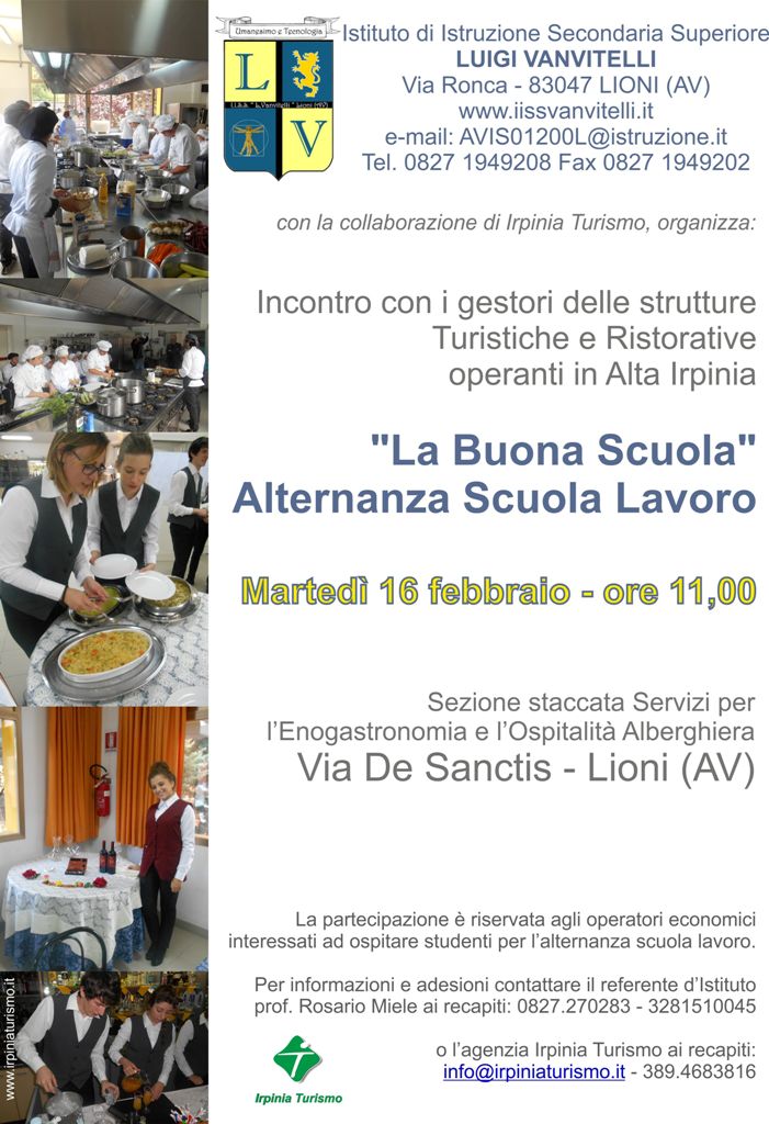 L’Istituto di Istruzione Secondaria Superiore “Luigi Vanvitelli” di Lioni, con la collaborazione e disponibilità dell’Agenzia Irpinia Turismo, in attuazione della riforma scolastica “La Buona Scuola”, organizza un incontro, con i rappresentanti di tutte le strutture Turistiche e Ristorative operanti nel territorio dell’Alta Irpinia, al fine di pianificare l’attività di Alternanza Scuola Lavoro, con eventuale prosieguo di Tirocinio estivo e borsa di studio, per gli studenti del settore servizi dell’Istituto, ed in particolare Servizi per l’Enogastronomia e l’Ospitalità Alberghiera.