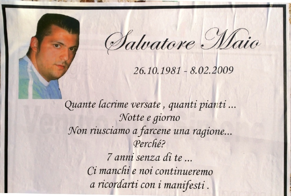 In occasione del settimo anniversario della scomparsa del compianto calciatore Salvatore Maio, colpito da un infarto l’8 febbraio del 2009 poco prima dell’inizio di una partita di calcio al campo sportivo “Vittorio Gatti” di Bagnoli Irpino, gli amici di sempre, i compagni di gioco, la società sportiva Vincenzo Nigro, lo ricordano con un manifestino semplice affisso in tutte le bacheche pubbliche collocate in giro per il paese.