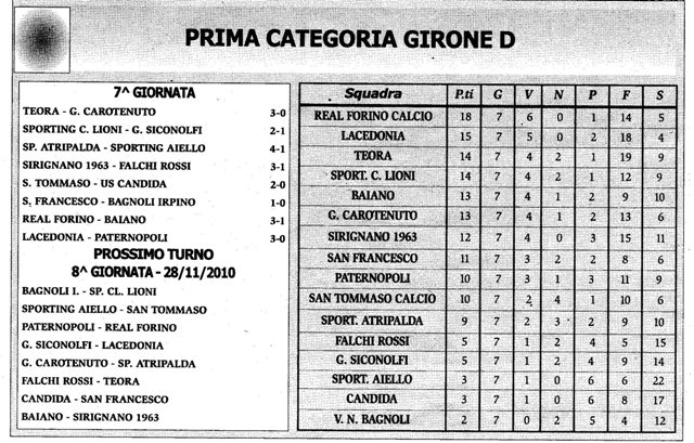 Atripalda: Al 4-4-2 del S. Francesco, Mister Pastore risponde con un inedito 5-3-2, tre difensori centrali Nigro Domenico, Gatta Ivan e Di Santo Carlo, con due esterni, Di Mauro Francesco a destra e Scolavino Angelo a sinistra. A centrocampo centrale Nigro Carmine a destra Russo Alessandro e a sinistra Chieffo Domenico. Romaniello prima punta e Nigro Antonio seconda punta. Al 5’ la squadra Bagnolese va vicino al goal con Nigro A. che in giravolta dal limite dell’area manda sulla traversa. Risponde il S. Francesco al 7’ con un tiro dai 25 metri che va alto sulla traversa. Il V. Nigro gioca bene e conquista il centrocampo e al 10’ ancora Nigro A. impegna il portiere avversario con un bel tiro dal limite dell’area. Al 30’ Romaniello batte una punizione dal limite ma il portiere controlla senza difficoltà. Il S. Francesco non riesce ad impensierire la difesa ospite, che controlla senza affanni la gara. Al 33’ sugli sviluppi di un calcio d’angolo Gatta Ivan sciupa da ottima posizione tirando sopra la traversa. Al 41’ l’azione più pericolosa del S. Francesco che con Dello Iacono sfiora il palo da buona posizione. Il primo tempo termina con un tiro di Chieffo D. che va di poco a lato.
