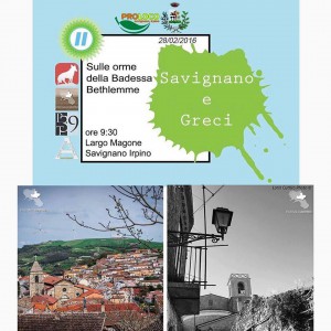 Appuntamento alle ore 09:30 presso Largo Magone a Savignano irpino, dove ammireremo il bellissimo centro storico, il castello, la chiesa madre, la tombola, via dei finestroni, porta grande e corso Vittorio Emanuele. Dopo una pausa pranzo ci recheremo alle 15:00 al vicino comune di Greci, esattamente in piazza Purgatorio, per imbatterci nella cultura dell’unico comune irpino noto per l’influenza delle culture arbëreshë. Qui visiteremo la Villa Comunale, il Castello, le “Halive” (capanna in albanese) antiche costruzioni arbëreshë, il Palazzo Caccese, la Chiesa Madre e il Museo della Mnemoteca..