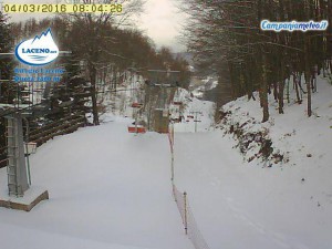 Laceno-Seggiovie-4.3.2016Come previsto torna la dama bianca sull’Irpinia, la neve marzolina ha imbiancato nelle ultime ore il Laceno* (spessore neve in vetta di circa 30 cm, ndr) e le cime più alte del Partenio e di Montevergine. A valle soltanto pioggia mista a qualche lieve fiocco di neve, mentre i monti sono stati già spruzzati con diversi centimetri di strati nevosi.