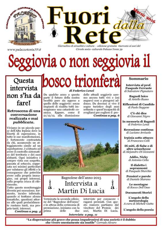E’ in uscita domenica 6 marzo “FUORI DALLA RETE”, il 1° numero 2016 del giornale di informazione ed approfondimento del Circolo socio-culturale “Palazzo Tenta 39″.