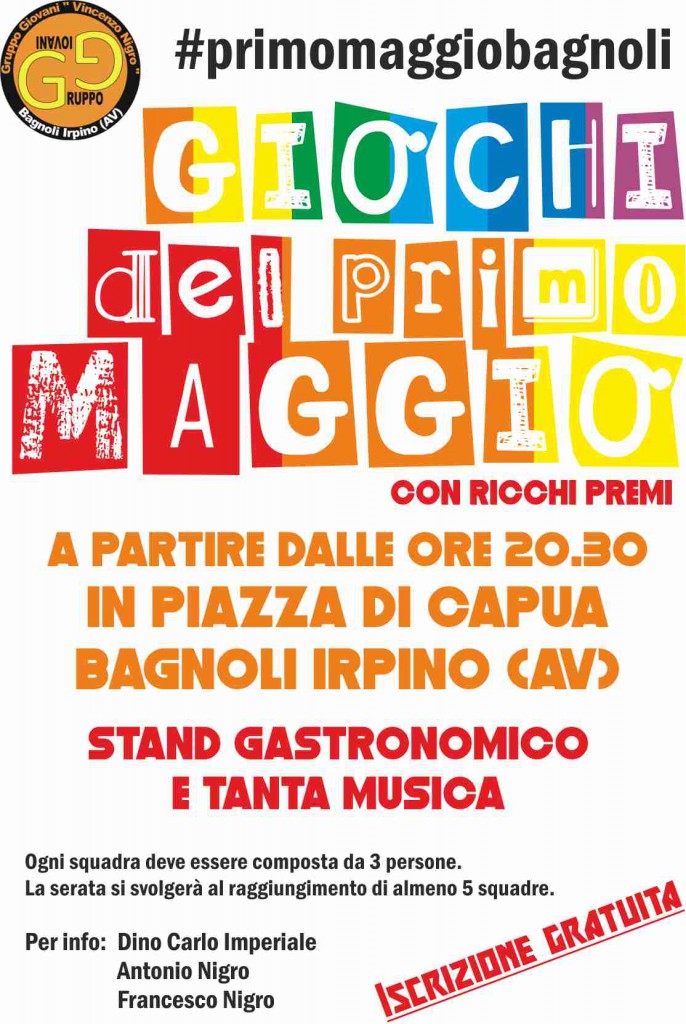 Il Gruppo Giovani “Vincenzo Nigro” organizza in occasione della Festa dei Lavoratori i GIOCHI DEL PRIMO MAGGIO a partire dalle ore 20:30 di Domenica 1 Maggio 2016 in Piazza L. Di Capua – Bagnoli Irpino AV. Previsti ricchi premi per i vincitori dei giochi in programmazione.