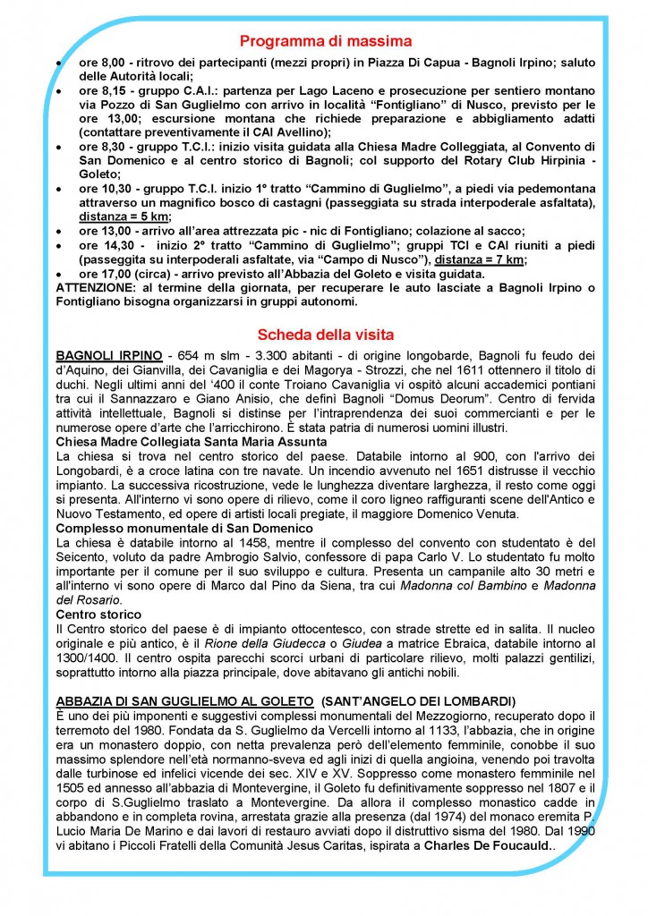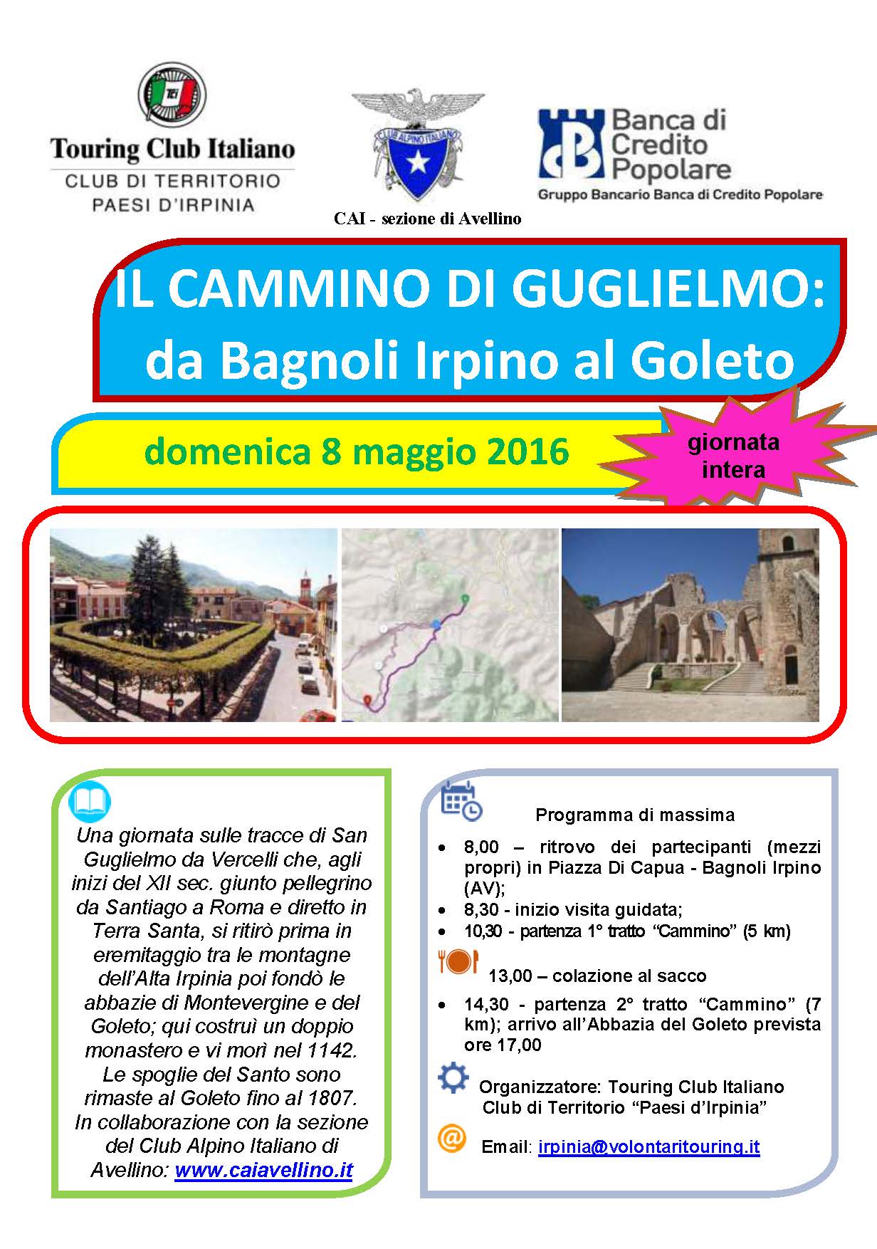 il-cammino-di-guglielmo-domenica-8-maggio-2016_Pagina_1Una giornata sulle tracce di San Guglielmo da Vercelli che, agli inizi del XII sec. giunto pellegrino da Santiago a Roma e diretto in Terra Santa, si ritirò prima in eremitaggio tra le montagne dell’Alta Irpinia poi fondò le abbazie di Montevergine e del Goleto; qui costruì un doppio monastero e vi morì nel 1142. Le spoglie del Santo sono rimaste al Goleto fino al 1807.