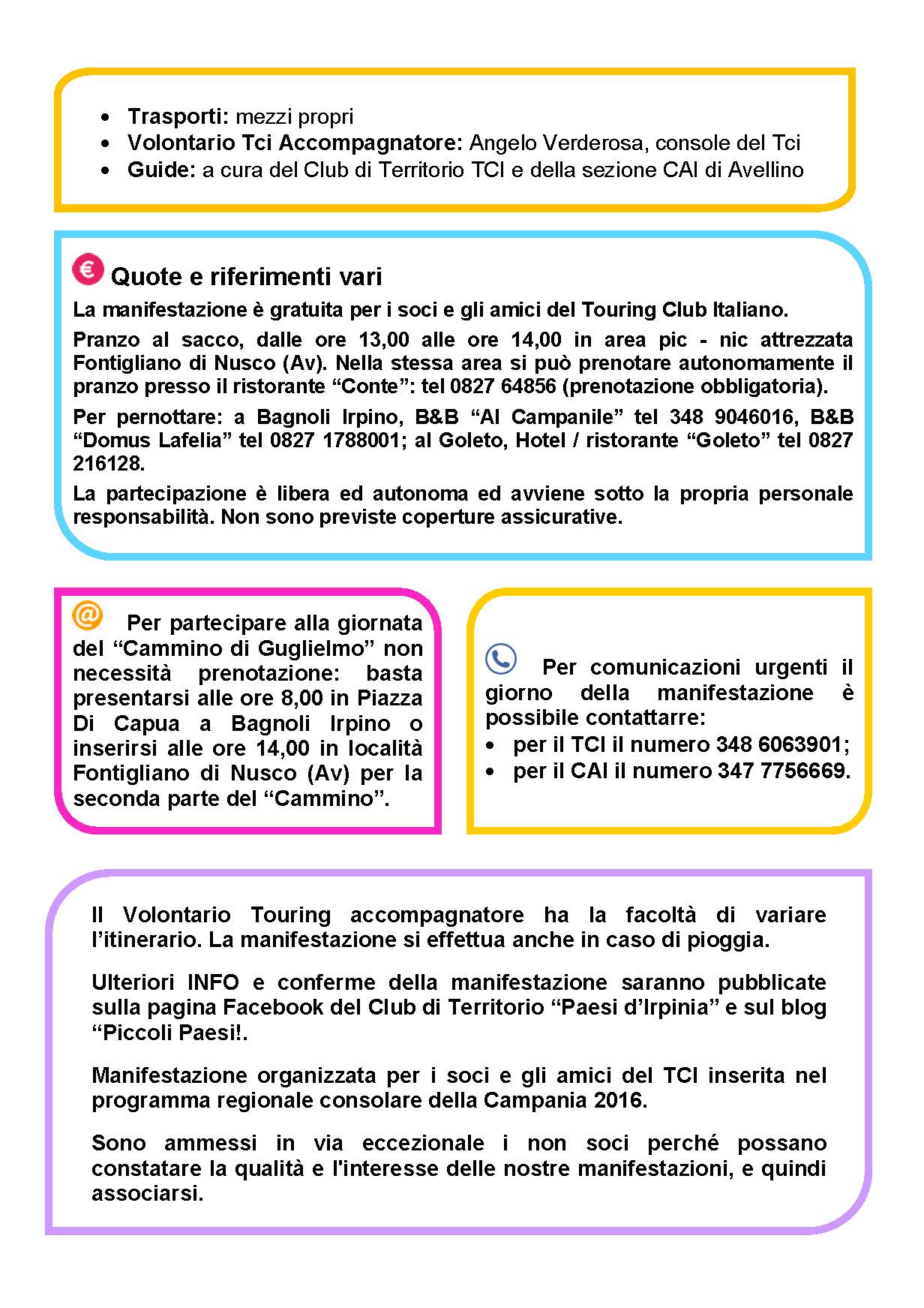 ATTENZIONE: al termine della giornata, per recuperare le auto lasciate a Bagnoli Irpino o Fontigliano bisogna organizzarsi in gruppi autonomi.