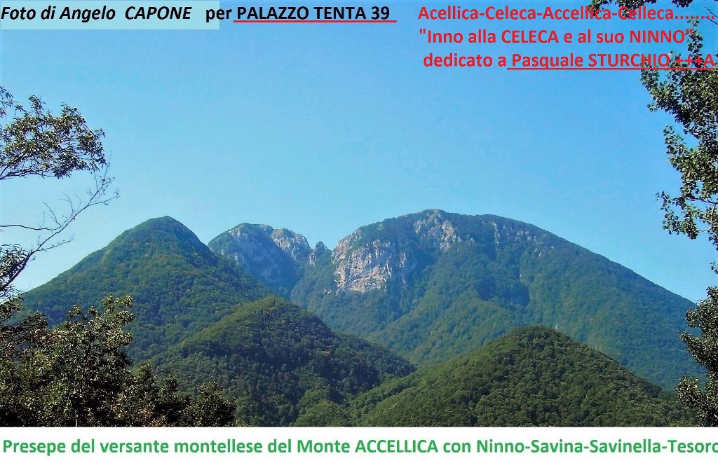 Una sorta di prosa canzonata (”poemetto”) finalizzata anche a “blindare” il magico territorio dell’Accellica e dintorni significativi. Dopo aver letto questo “Poemetto”, Giovannino, idealmente, e Pasquale, mediaticamente, mi contattavano e rispettivamente: Dalle Mezzane, Giovannino (piu’ ascetico, spesso in gilera, itinerante per Eremi e per Conventi, proiettava visioni PRESEPIALI DELLA NATIVITA’ che trasalivano dal profondo della sua anima candida, incline, permeabile alle favole, al credo, alla FEDE) guardando l’insieme della Celeca, evocava i TRE MAGI (SAVINA, SAVINELLA e TESORO) inchiodati al cospetto del Bambinello: IL NINNO ‘ngrillato verso la STELLA POLARE credente e annunciante, (per altri, agnostici: verso le stelle incredule), con le tre cime “coniche” rivolte allo ZENIT: spicchio della VOLTA CELESTE sulla verticale delle Croci di Acerno.“Croci “ già pronte per il GOLGOTA terreno del CRISTO poco più che trentenne. Tutto coerente per Giovannino Palatucci pervaso di fede a suo modo vissuta.