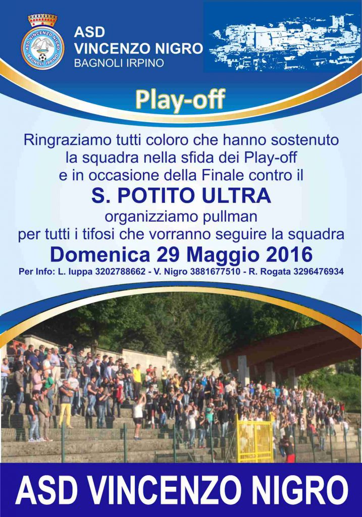 Ringraziamo tutti coloro che hanno sostenuto la squadra nella sfida della semifinale dei play-off contro la Virtus Volturara e in occasione della Finalissima (partita unica) contro il San Potito Ultra organizziamo pullman gratuiti per tutti i tifosi che vorranno seguire la squadra per il pomeriggio di Domenica 29 maggio 2016.