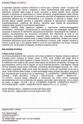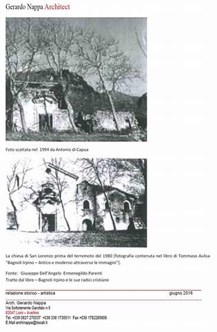 Per quanto riguarda le Sue precisazioni alla relazione storica allegata al progetto, ribadisco quanto già scritto nella mia mail precedente (di cui ha volutamente ignorato il senso): «Nella RELAZIONE STORICA, Elaborato Tav. 1 del Progetto dei “LAVORI DI CONSOLIDAMENTO E RESTAURO DELLA CHIESA DI S. LORENZO in Bagnoli Irpino” l’Arch. Nappa ha riportato, oltre al testo della ricerca storica, anche le foto e le relative didascalie prelevate dal libro “Bagnoli Irpino e le sue radici cristiane”, realizzando ben otto facciate della sua relazione (peraltro non numerate). Su ogni facciata compare: in alto, nell’intestazione, a caratteri ingranditi, la dicitura “Gerardo Nappa Architect”; in basso a piè pagina, di nuovo il nome, l’indirizzo ed i recapiti telefonico, fax, mail dell’architetto. Solo alla fine, sull’ottava facciata, in basso, sotto una fotografia, compare in caratteri rimpiccioliti, da didascalia, il riferimento “Fonte: Giuseppe Dell’Angelo Ermenegildo Parenti Tratto dal libro – Bagnoli Irpino e le sue radici cristiane”. Chi legge questa relazione di progetto non è indubbiamente in grado di capire se il riferimento alla fonte sia relativo all’ultima foto, all’intera ottava pagina o a quale parte della relazione».