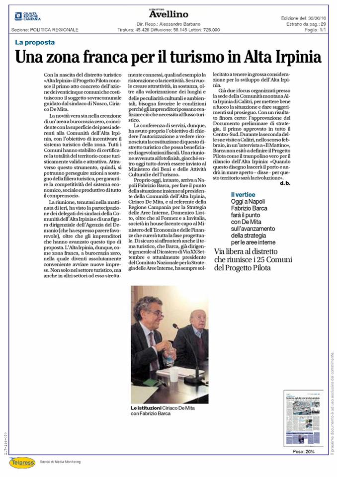 Istituito con decreto dal ministro Franceschini il distretto turistico “Alta Irpinia” che comprende i territori dei comuni di Sant’Andrea di Conza, Morra De Sanctis, Lioni, Bagnoli Irpino, Calabritto, Andretta, Bisaccia, Montella, Senerchia, Aquilonia, Calitri, Cairano, Lacedionia, Conza della Campania, Guardia dei Lombardi, Cassano Irpino, Rocca San Felice, Sant’angelo del Lombardi, Torella dei Lombardi, Teora, Caposele, Villamaina, Monteverde, Nusco, Castelfranci.
