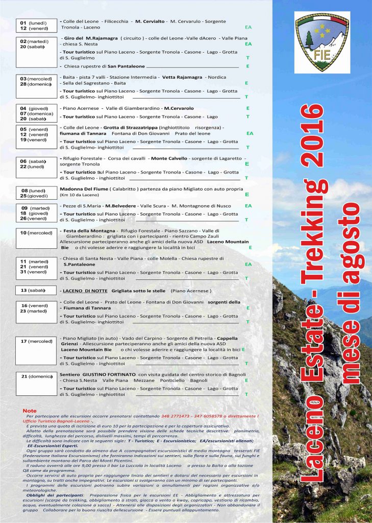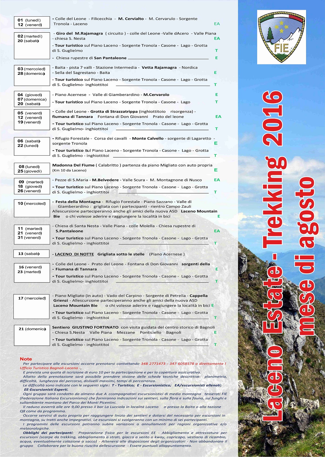 05 (venerdì) 12 (venerdì) 19 (venerdì) – Colle del Leone – Grotta di Strazzatrippa (inghiottitoio – risorgenza) – fiumana di Tannara – Fontana di Don Giovanni – Prato del leone EA – Tour turistico sul Piano Laceno – Sorgente Tronola – Casone – Lago – Grotta di S. Guglielmo- inghiottitoi T