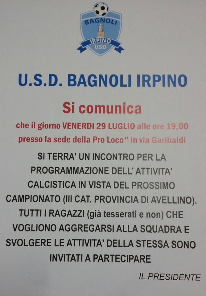 Si comunica che il giorno venerdì 29 luglio alle ore 19,00 presso la sede della Pro Loco in Via Garibaldi a Bagnoli si terrà un incontro per la programmazione dell’attività calcistica in vista del prossimo campionato (III Provincia di Avellino).