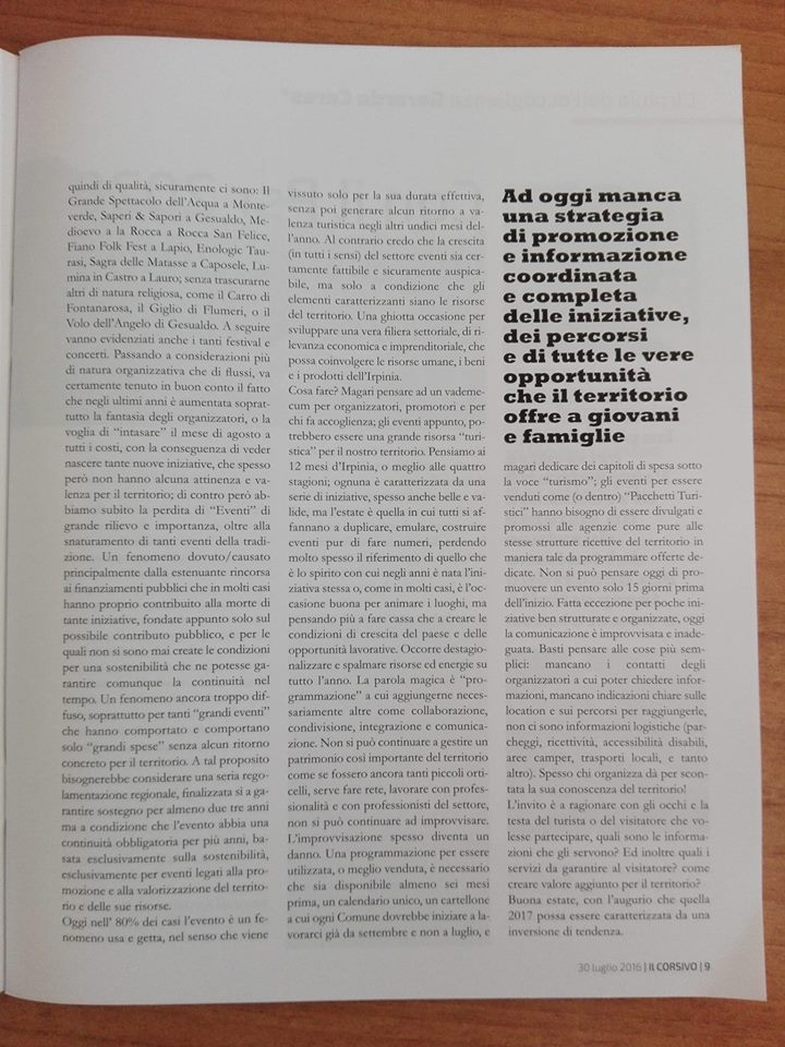 Oggi nell’ 80% dei casi l’evento è un fenomeno usa e getta, nel senso che viene vissuto solo per la sua durata effettiva, senza poi generare alcun ritorno a valenza turistica negli altri undici mesi dell’anno. Al contrario credo che la crescita (in tutti i sensi) del settore eventi è certamente fattibile, e sicuramente auspicabile, ma solo a condizione che gli elementi caratterizzanti siano le risorse del territorio; una ghiotta occasione per sviluppare una vera filiera settoriale, di rilevanza economica e imprenditoriale, che possa coinvolgere le risorse umane, i beni e i prodotti dell’Irpinia.