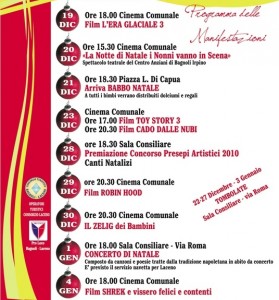 Previste 5 proiezioni cinematografiche (per bambini e adulti) pressso il Cinema Comunale, 3 tombolate presso la Sala Consiliare, spettacoli teatrali (protagonisti i bambini e gli anziani del Centro di aggregazione “F.Lenzi”), canti natalizi, la premiazione del concorso presepi artistici ed il concerto di Natale con canzoni e poesie della migliore tradizione napoletana.