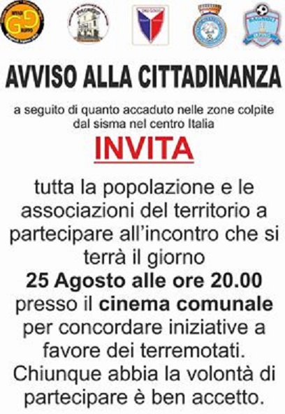 Invitano, inoltre, la cittadinanza e tutte gli ente e le associazioni presenti sul territorio a partecipare alla riunione che si terrà oggi 25 agosto alle ore 20:00 presso il cinema comunale per concordare eventuali iniziative da realizzare tutti insieme a favore delle popolazioni colpite.