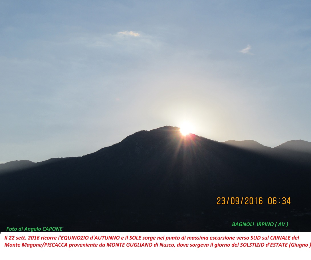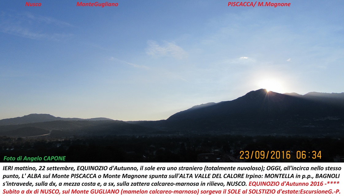 Allego foto commentate dell’ALBA sul MONTE PISCACCA nel giorno dell’EQUINOZIO di Autunno.In omaggio allego anche una foto dell’ECLISSI sul TIMPONE dell’ACCELLICA del 2015.